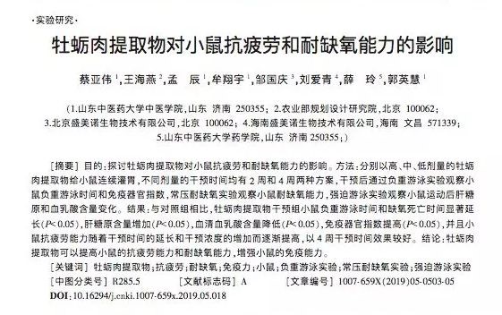 《山東中醫(yī)藥大學(xué)學(xué)報(bào)》題為《牡蠣肉提取物對(duì)小鼠抗疲勞和耐缺氧能力的影響》論文